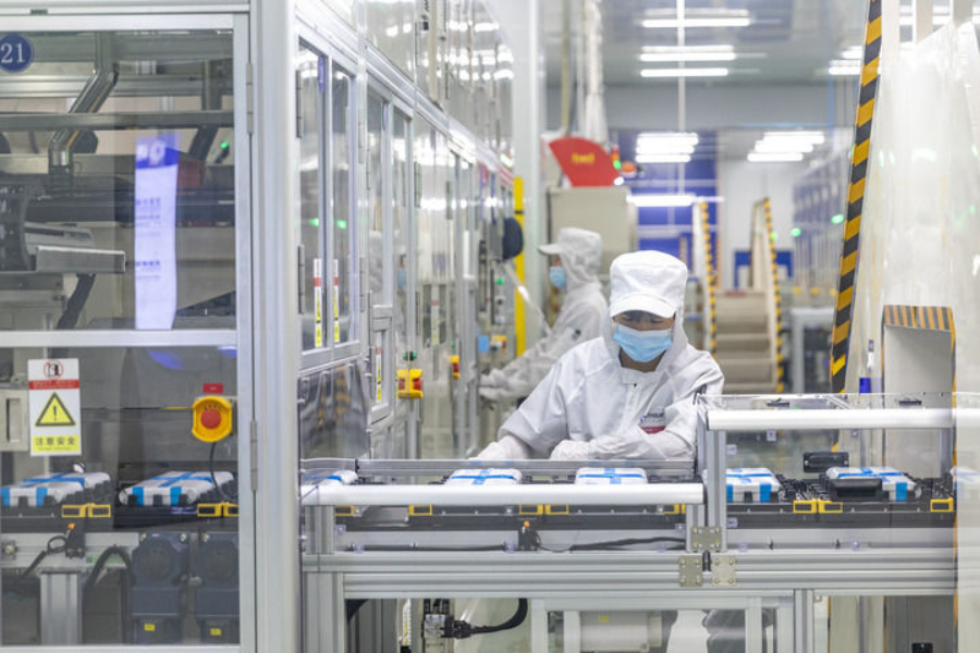 2024年9月27日,在位于重慶市銅梁區(qū)的海辰儲(chǔ)能重慶制造基地,工作人員在生產(chǎn)線上初步檢測兩個(gè)電芯是否配對(duì)。新華社記者 黃偉 攝