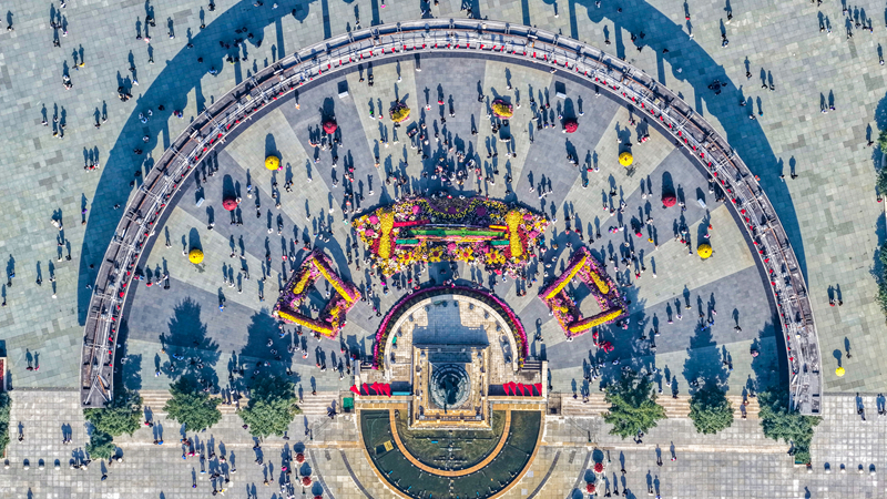 10月2日,游客在黑龍江省哈爾濱市防洪勝利紀(jì)念塔廣場游玩(無人機(jī)照片)。