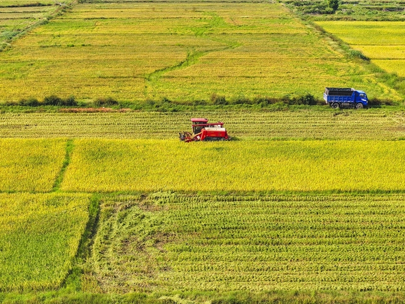 10月11日,湖南省衡陽市衡山縣白果鎮(zhèn)村民駕駛農(nóng)機收割稻谷(無人機照片)。