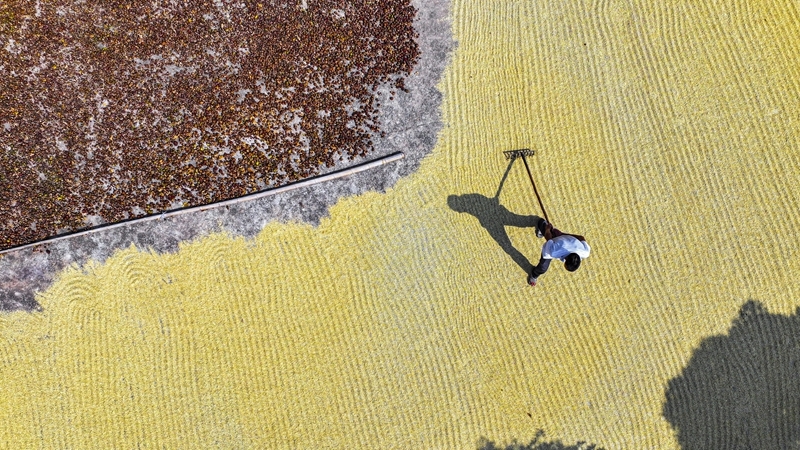 10月11日,湖南省常寧市蘭江鄉(xiāng)農(nóng)民在晾曬稻谷(無人機照片)。