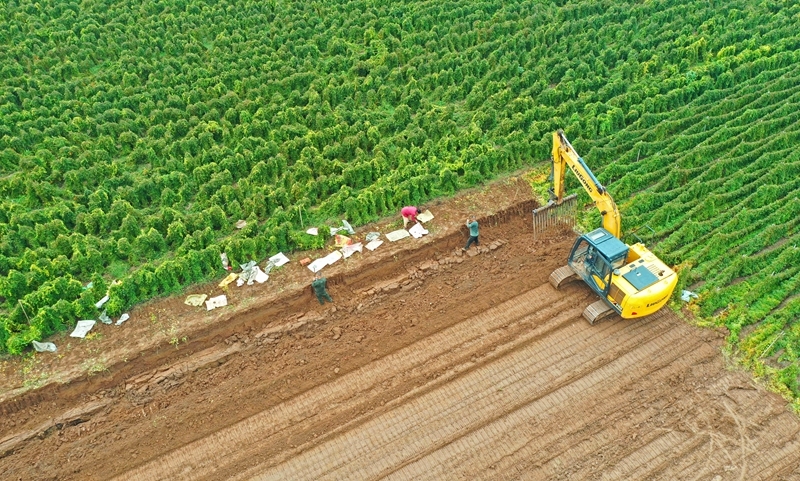 10月11日,河南省焦作市孟州市城伯鎮(zhèn)西后津村農(nóng)民在田間搶收鐵棍山藥(無人機照片)。