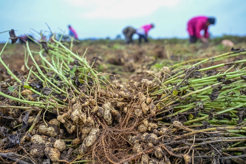 10月11日,河南省洛陽市瀍河區(qū)白馬寺鎮(zhèn)翟泉村農(nóng)民在收獲花生。