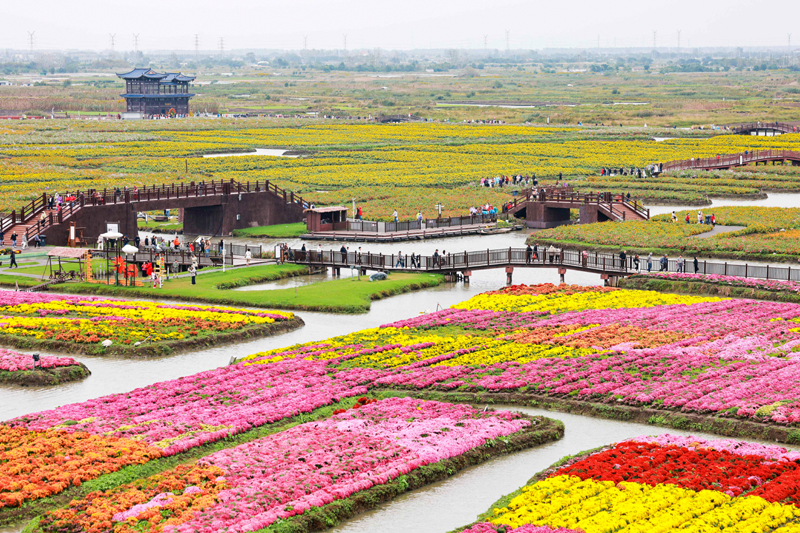 10月18日,游客在江蘇省興化市千垛景區(qū)賞花游玩。