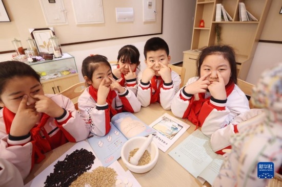 3月24日,河北省廊坊市第五小學(xué)學(xué)生在該校國(guó)醫(yī)館內(nèi)跟隨老師識(shí)別中藥。