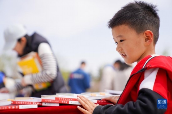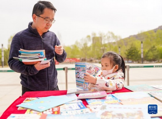 4月22日,一名小朋友在吉林省圖書館前的“換書大集”挑選圖書。