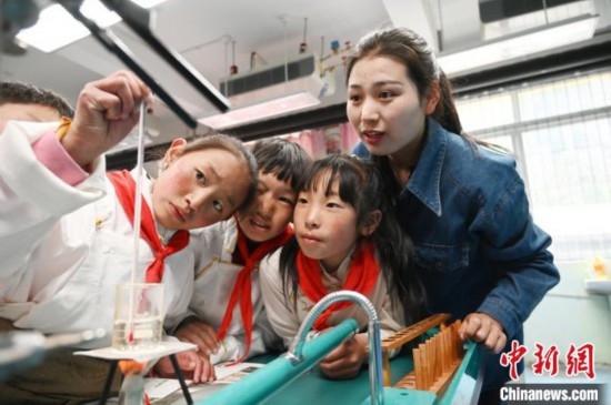 5月18日,四川阿壩州壤塘縣寄宿制學(xué)校學(xué)生在科學(xué)課做實(shí)驗(yàn)。中新社記者 安源 攝
