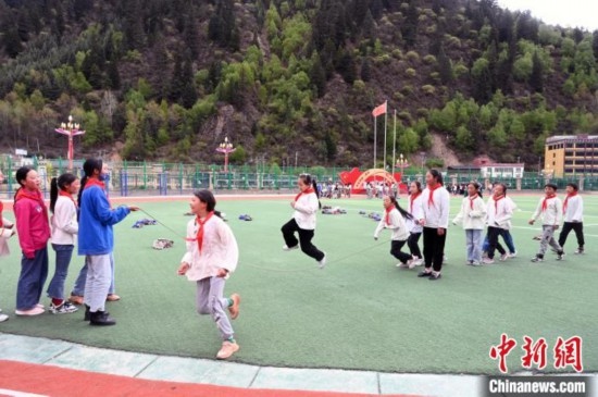 5月17日,四川阿壩州壤塘縣寄宿制學(xué)校的學(xué)生在操場(chǎng)跳繩。中新社記者 安源 攝