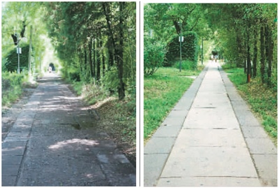 左圖:保護項目對燕南園水泥路修復前的景象。右圖:保護項目對燕南園水泥路進行修復后的效果。燕南園保存下來的水泥路以“脫漿彩石混凝土”工藝進行施工,老校友稱之為“洋灰路”。這里的“洋灰路”已有76年歷史,大部分仍能正常使用。北大建筑與景觀設計學院的李迪華老師發(fā)現(xiàn),燕南園東側(cè)水泥路破損后,顯露出大小和顏色都參差不齊的石子。于是,他開始追溯這些“洋灰路”的歷史價值,與北大“燕園公益營建社”的黃可同學翻閱北大檔案館資料,找到了歷史照片。又幾經(jīng)輾轉(zhuǎn),尋訪到了九旬高齡的老校友。研究發(fā)現(xiàn),燕園中最早的水泥路修建于1948年。為此,李迪華大力呼吁保護這些水泥路,尋訪到專門修復歷史路面的施工團隊,對少量保存完整的路面進行修復;破損的洋灰原料則被回收,取出原骨料,采用相同的工藝進行還原。不僅老材料得到循環(huán)利用,歷史道路的價值也“凝固”在更新后的路面中。