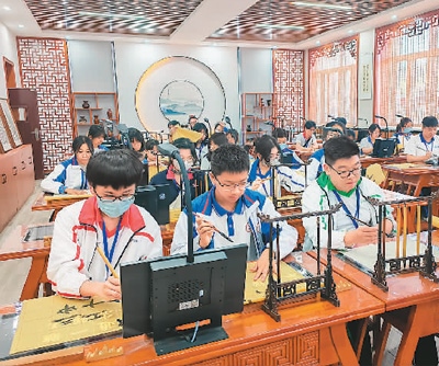 |   5月7日,參加“寧夏歷史文化、自然資源與環(huán)境保育探索之旅”交流活動的香港中學(xué)生在寧夏銀川市第六中學(xué)學(xué)寫毛筆字。新華社記者 艾福梅攝  |