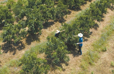 | 曹立新(右)在柑橘基地里給農(nóng)民做技術指導。鄭家裕攝 |