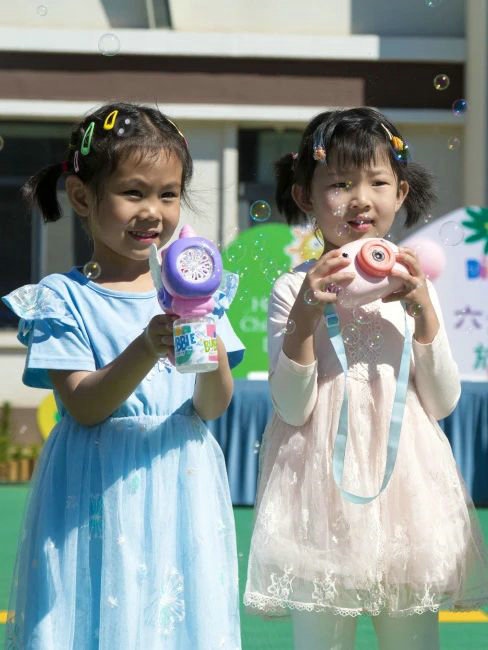 當(dāng)日,打扮成迪士尼童話里人物的老師們與盛裝打扮的小朋友們,共同手持泡泡機(jī),在晶瑩剔透的泡泡里一起沉浸在童話世界里。