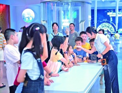 暑期,安徽省科技館在常設(shè)展覽之外開(kāi)展研學(xué)營(yíng)、科學(xué)課程、科學(xué)實(shí)驗(yàn)等科普活動(dòng),讓孩子們?cè)谪S富多彩的活動(dòng)中感受科技魅力。圖為7月10日,工作人員與參加研學(xué)營(yíng)的小朋友互動(dòng)。(新華社記者 傅天攝)