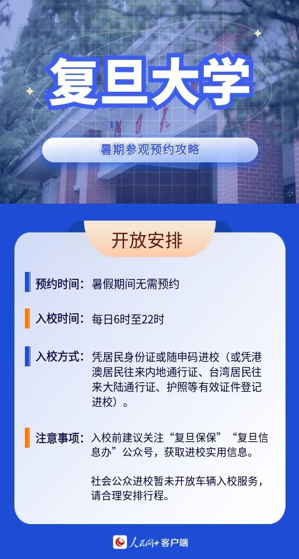 人民網(wǎng)北京7月19日電 暑假來臨,帶孩子參觀高校,感受學(xué)校人文歷史底蘊以及濃厚的學(xué)術(shù)氛圍,已經(jīng)成為很多家長的選擇。近日,全國多所高校開放校園,接受公眾參觀。那么如何預(yù)約進(jìn)校?有什么注意事項?人民網(wǎng)特別整理了部分高校的參觀預(yù)約攻略,一起來看。(郝孟佳、實習(xí)生趙雪祺)