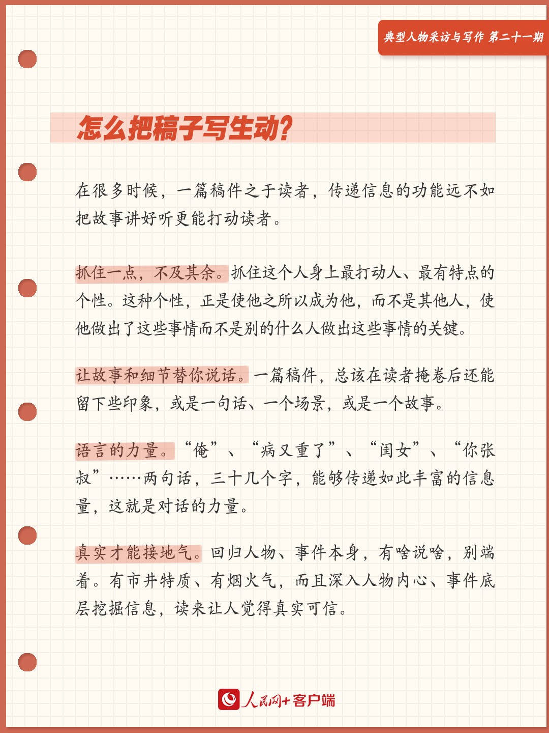 抓住一點(diǎn),不及其余。副縣長、信訪局長、基層民警、環(huán)衛(wèi)局長……這些被評(píng)為“人民滿意的公務(wù)員”的采訪對(duì)象,每個(gè)人身上都有一串光榮事跡,若是有聞必錄,大概寫五六千字也打不住。怎樣在千字內(nèi)把故事講好,讓采訪對(duì)象躍然紙上?