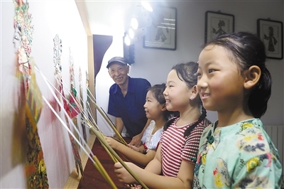 非遺體驗河北省唐山市豐潤區(qū)浭陽街道華府社區(qū)開設(shè)“非遺”小課堂,小朋友們在學(xué)習(xí)表演皮影戲。 朱大勇攝(人民視覺)