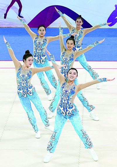 12月5日,第18屆中國大學生健美操錦標賽在河北省遷安市舉行。圖為江西師范大學代表隊在甲組中國大學生中級校園健美操規(guī)定動作決賽中。新華社記者 楊世堯攝