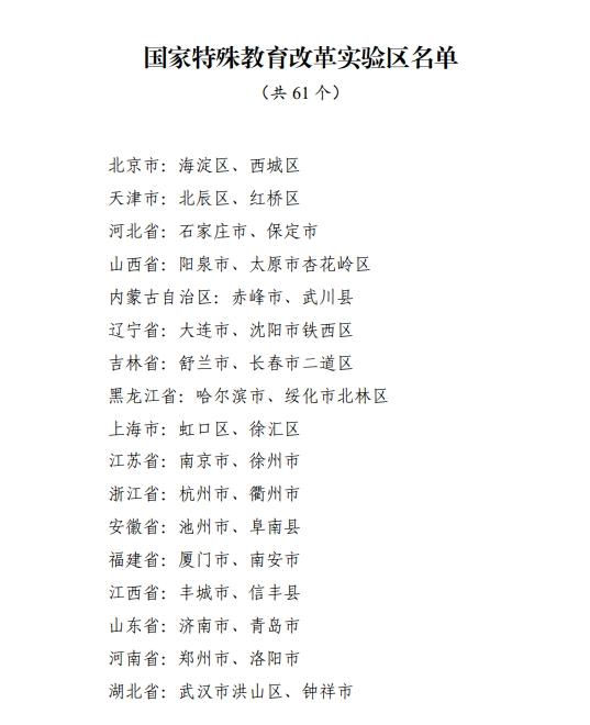 記者2月10日從教育部獲悉,經(jīng)各地自主申報(bào)、省級(jí)推薦、網(wǎng)絡(luò)公示等環(huán)節(jié),認(rèn)定北京市海淀區(qū)等61個(gè)國家特殊教育改革實(shí)驗(yàn)區(qū)。
