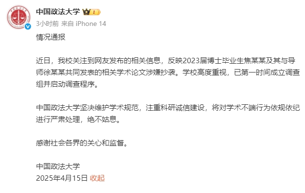 人民網(wǎng)北京4月15日電 (記者孫競(jìng))今天上午,中國(guó)政法大學(xué)發(fā)布情況通報(bào)稱,該校關(guān)注到網(wǎng)友發(fā)布的相關(guān)信息,反映2023屆博士畢業(yè)生焦某某及其與導(dǎo)師徐某某共同發(fā)表的相關(guān)學(xué)術(shù)論文涉嫌抄襲。學(xué)校高度重視,已第一時(shí)間成立調(diào)查組并啟動(dòng)調(diào)查程序。