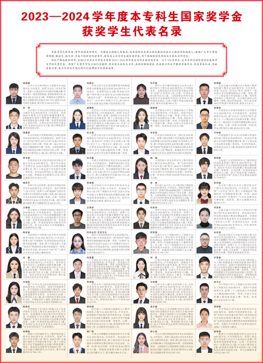 經(jīng)過(guò)嚴(yán)格選拔和評(píng)審,全國(guó)12萬(wàn)名本專(zhuān)科學(xué)生榮獲2023—2024學(xué)年度本專(zhuān)科生國(guó)家獎(jiǎng)學(xué)金。以下100名學(xué)生,是本專(zhuān)科生國(guó)家獎(jiǎng)學(xué)金獲獎(jiǎng)學(xué)生中的優(yōu)秀代表。希望廣大青年學(xué)生以他們?yōu)榘駱?,勇?dāng)排頭兵和生力軍,在推進(jìn)強(qiáng)國(guó)建設(shè)、民族復(fù)興偉業(yè)中展現(xiàn)青春作為、彰顯青春風(fēng)采、貢獻(xiàn)青春力量,奮力書(shū)寫(xiě)為中國(guó)式現(xiàn)代化挺膺擔(dān)當(dāng)?shù)那啻浩隆?/p>