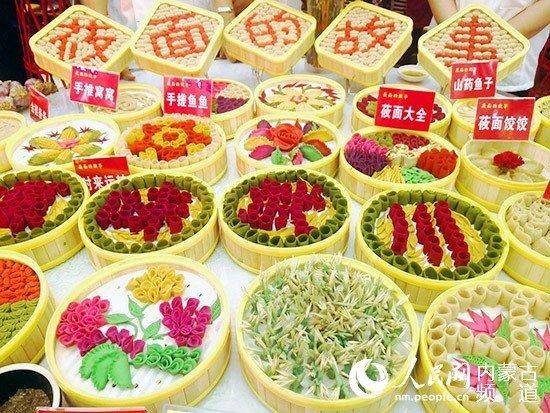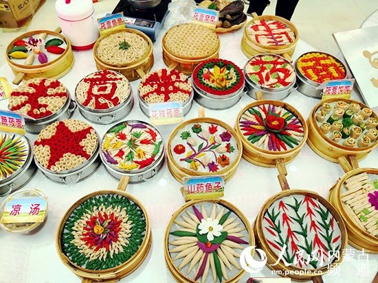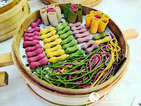 莜面師傅用五彩莜面拼寫(xiě)“武川莜面甲天下”字樣。陳立庚攝