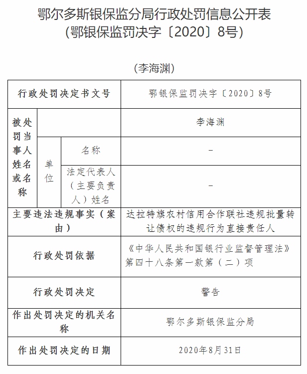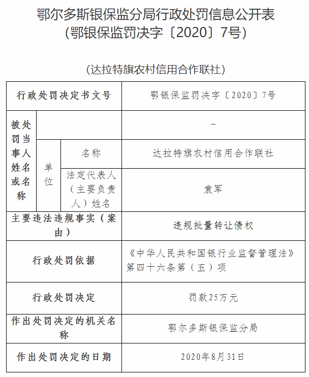 北疆新聞網(wǎng)、北疆新聞客戶端消息(記者 張楊)11月5日,銀保監(jiān)會官網(wǎng)通報達拉特旗農(nóng)村信用合作聯(lián)社違規(guī)批量轉(zhuǎn)讓債權(quán),被鄂爾多斯銀保監(jiān)分局依據(jù)《中華人民共和國銀行業(yè)監(jiān)督管理法》第四十六條第(五)項,處以罰款25萬元。其法定代表人李海淵作為達拉特旗農(nóng)村信用合作聯(lián)社違規(guī)批量轉(zhuǎn)讓債權(quán)的違規(guī)行為直接責任人,被鄂爾多斯銀保監(jiān)分局依據(jù)《中華人民共和國銀行業(yè)監(jiān)督管理法》第四十八條第一款第(二)項,處以警告處罰。