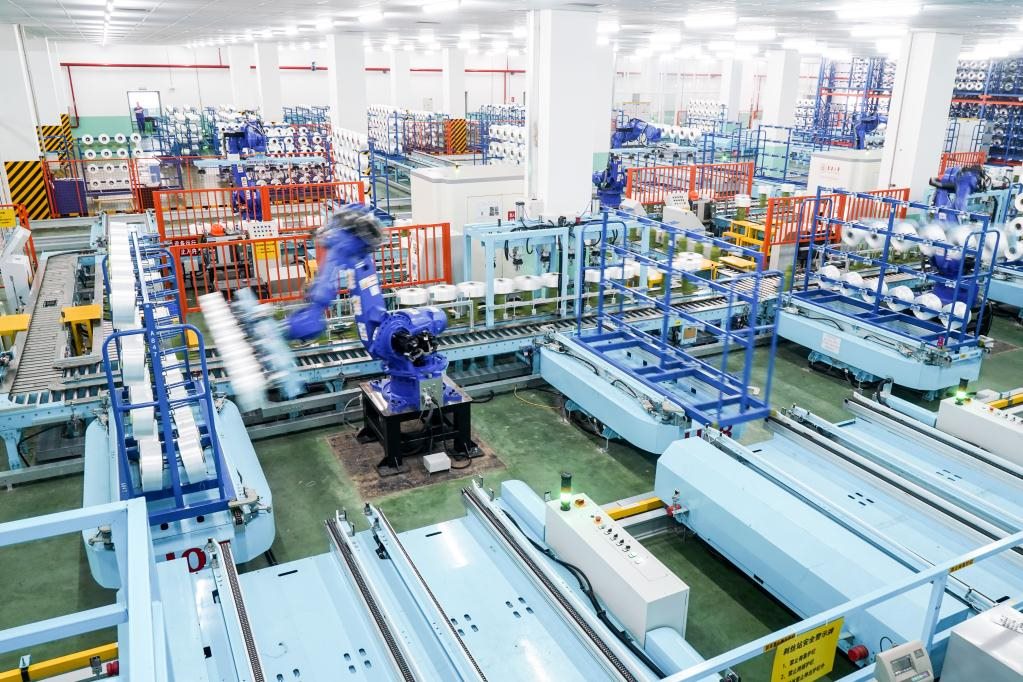 位于江蘇省蘇州市吳江區(qū)盛澤鎮(zhèn)的一家智能車間,機(jī)器人在車間內(nèi)自動作業(yè)。新華社記者 李博 攝