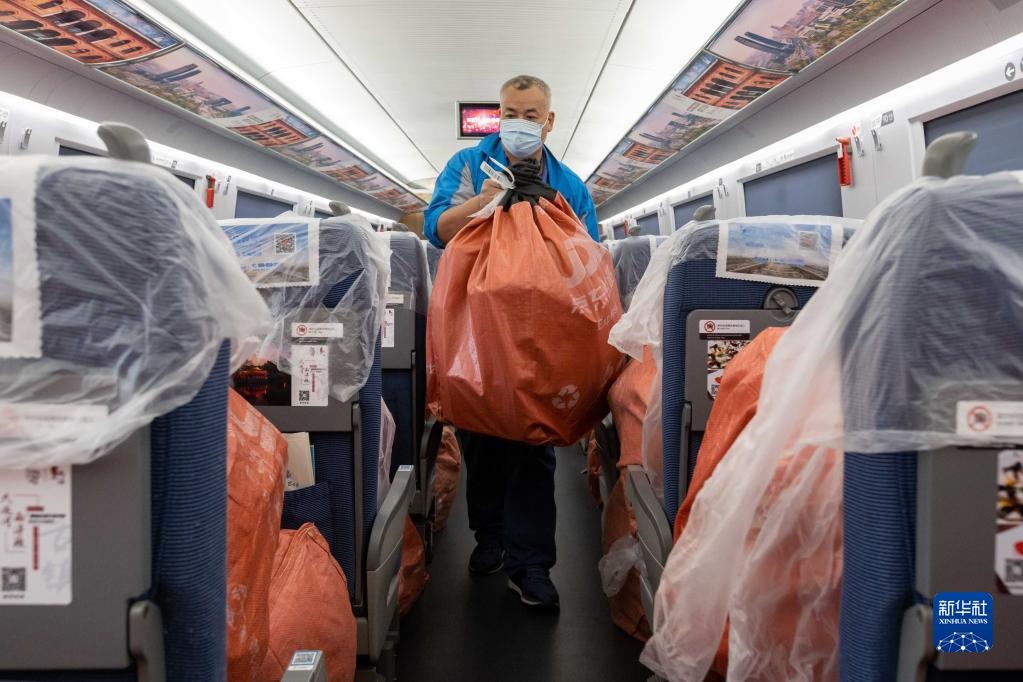 11月1日,在G1373次列車上,鐵路工作人員搬運(yùn)貨物。新華社記者 王翔 攝
