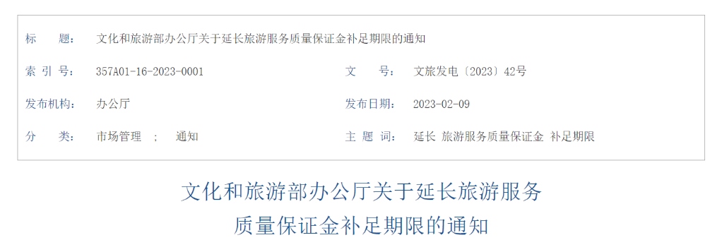 根據(jù)通知,2023年4月1日(含當(dāng)日)以后取得旅行社業(yè)務(wù)經(jīng)營許可證的旅行社,可申請暫緩交納保證金,補(bǔ)足保證金期限為2024年3月31日。