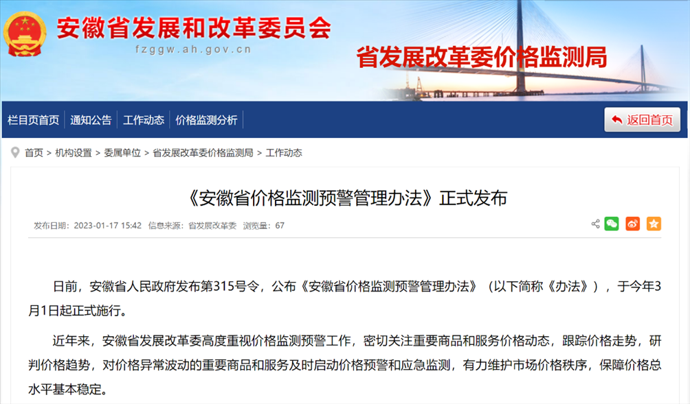 《安徽省價格監(jiān)測預警管理辦法》。圖片來源:安徽省發(fā)展和改革委員會