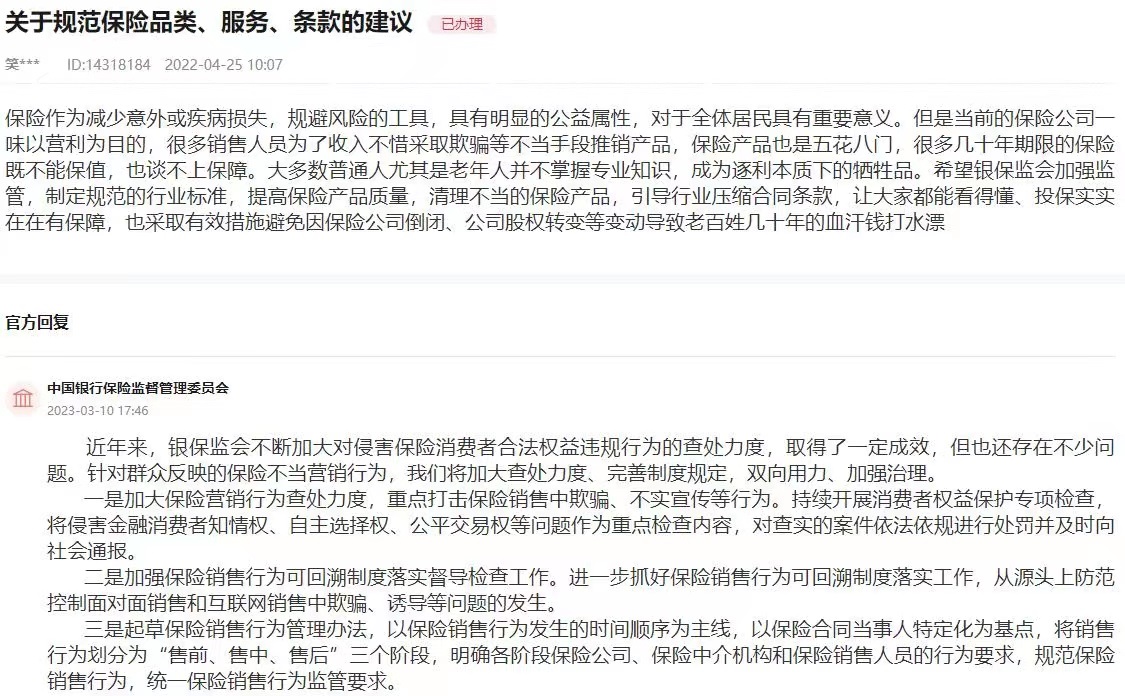 “近年來(lái),銀保監(jiān)會(huì)不斷加大對(duì)侵害保險(xiǎn)消費(fèi)者合法權(quán)益違規(guī)行為的查處力度,取得了一定成效,但也還存在不少問(wèn)題。”銀保監(jiān)會(huì)在回復(fù)中表示,針對(duì)群眾反映的保險(xiǎn)不當(dāng)營(yíng)銷行為,將加大查處力度、完善制度規(guī)定,雙向用力、加強(qiáng)治理。