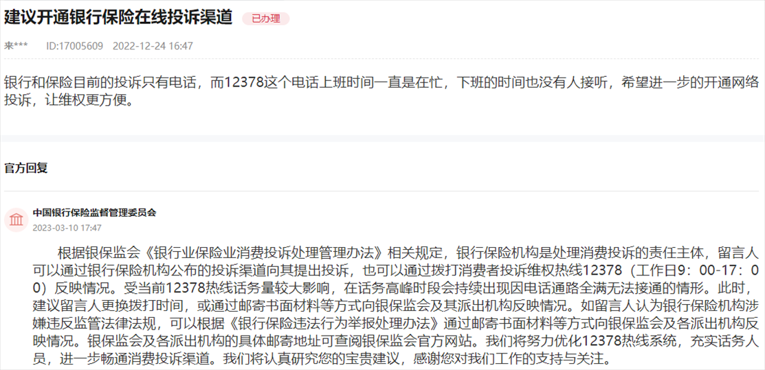 針對(duì)網(wǎng)友提出的“建議開通銀行保險(xiǎn)在線投訴渠道”,銀保監(jiān)會(huì)在回復(fù)中表示,將努力優(yōu)化消費(fèi)者投訴維權(quán)熱線12378系統(tǒng),充實(shí)話務(wù)人員,進(jìn)一步暢通消費(fèi)投訴渠道。