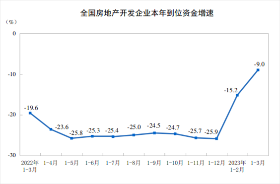 1—3月份,房地產(chǎn)開(kāi)發(fā)企業(yè)到位資金34708億元,同比下降9.0%。其中,國(guó)內(nèi)貸款4995億元,下降9.6%;利用外資8億元,下降22.7%;自籌資金10171億元,下降17.9%;定金及預(yù)收款11909億元,下降2.8%;個(gè)人按揭貸款6188億元,下降2.9%。