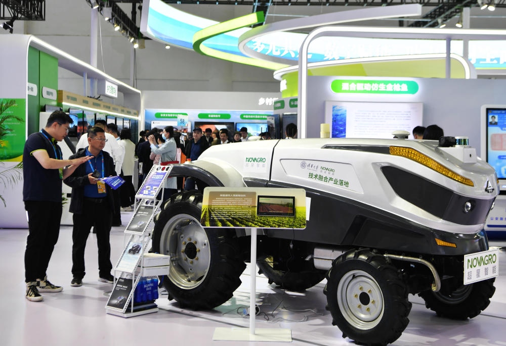 在第六屆數(shù)字中國建設峰會智慧農(nóng)業(yè)展廳展出的新能源無人駕駛智能拖拉機吸引參觀者駐足觀看(4月26日攝)。新華社記者 魏培全 攝