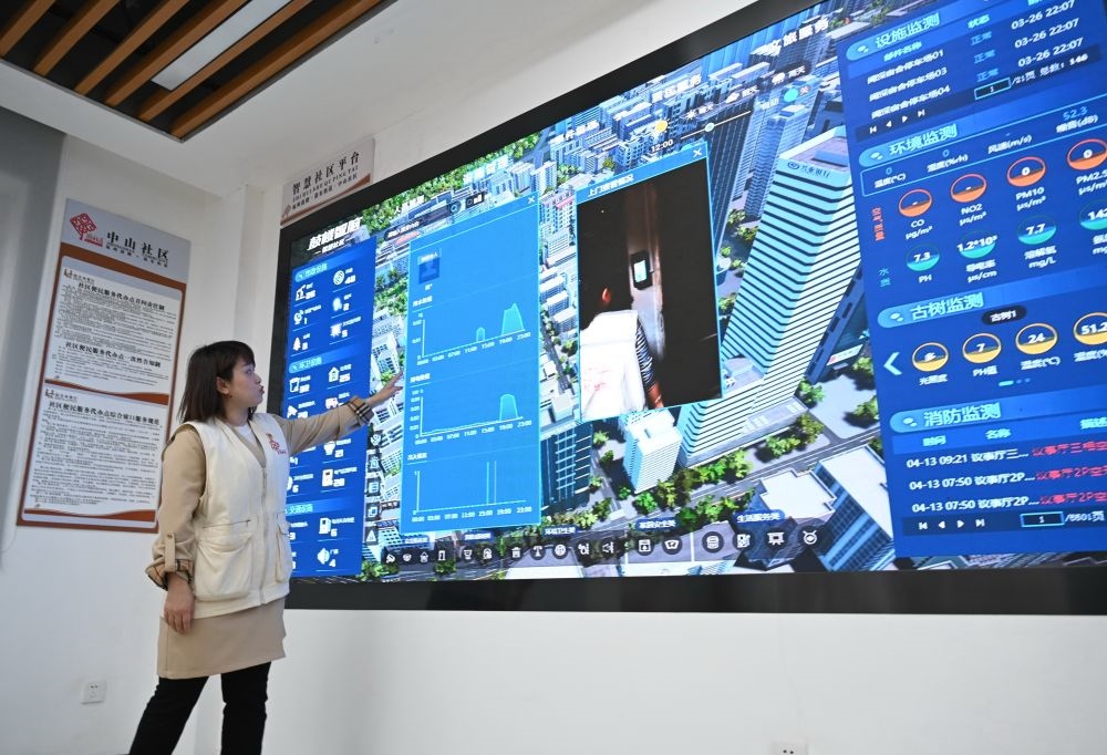 福州市鼓樓區(qū)是國家智能社會治理綜合實驗基地,社區(qū)工作者林英在鼓樓區(qū)鼓東街道中山社區(qū)介紹“智慧社區(qū)”建設提升基層治理能力情況(4月25日攝)。新華社記者 林善傳 攝