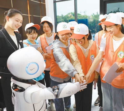 “數(shù)游峨眉”體驗中心,參加研學(xué)的學(xué)生與智能講解機(jī)器人互動。 峨眉山市融媒體中心供圖