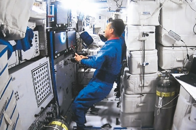 5月11日,天舟六號貨運飛船與空間站組合體完成交會對接后,天和核心艙內的畫面。 新華社記者 郭中正攝