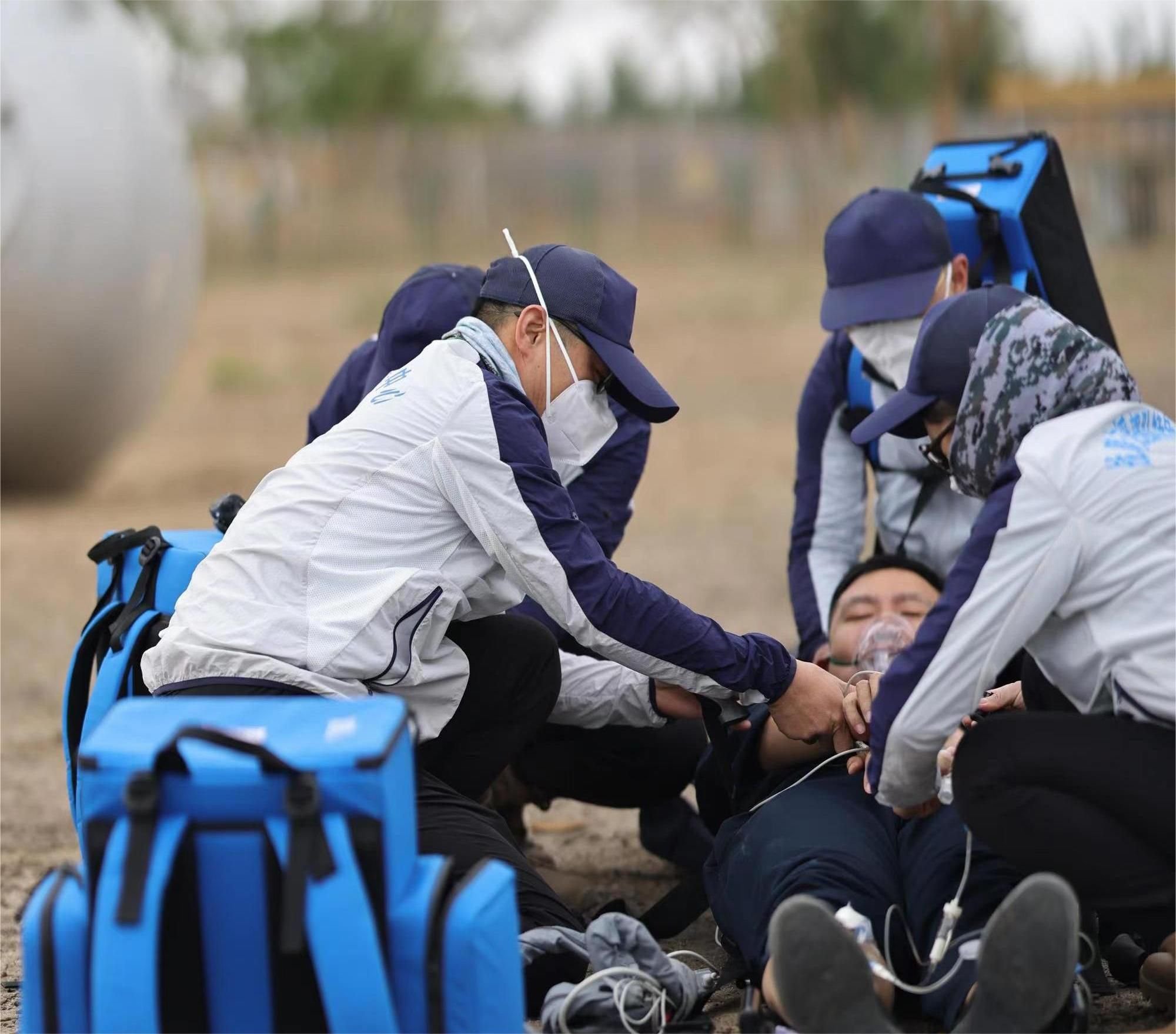 醫(yī)學急救“白金10分鐘、黃金1小時”,針對可能出現(xiàn)的飛船返回偏離落點,落在沙漠、山地、湖泊,搜救直升機無法降落,車輛無法進入的情況,為快速到達著陸地點,醫(yī)療救護隊員每天隨身攜帶艙前急救設(shè)備堅持訓(xùn)練六七個小時,負重在沙漠、山地中奔跑,爭取最短時間展開緊急救治。夏日戈壁驕陽似火,風沙彌漫,訓(xùn)練一天下來,隊員們耳朵眼里都是沙土,臉上脖子全是泥印,一個個都成了泥人。茫茫大草原記錄了神舟載人飛行任務(wù)醫(yī)療隊員們一次次醫(yī)療救護空地協(xié)同演練、全域協(xié)同演練的身影……