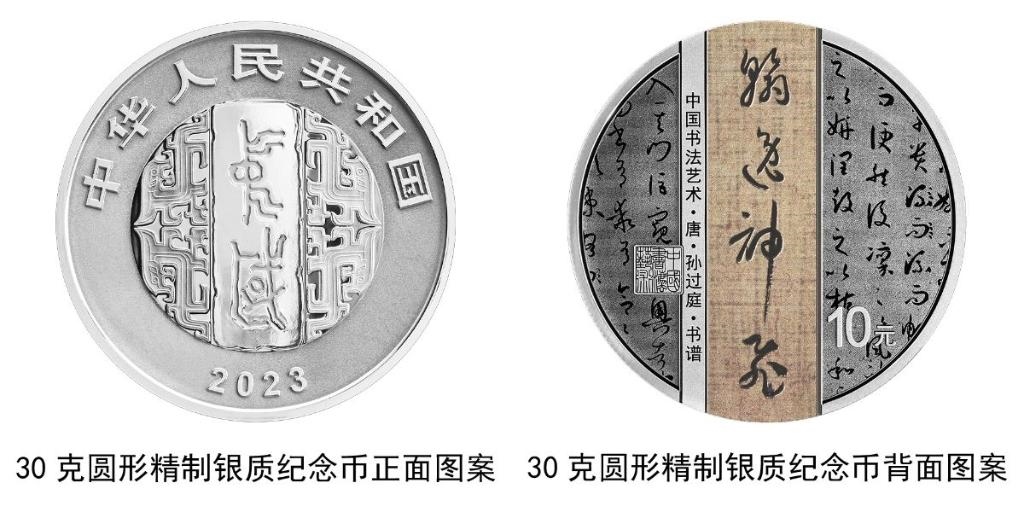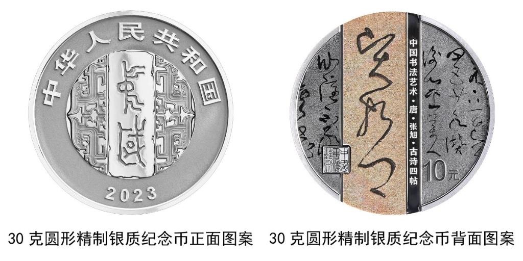 30克圓形銀質(zhì)紀念幣背面圖案為唐代張旭書《古詩四帖》局部文字及“賢哲”字樣與“中國書法藝術”篆刻鈐印等組合設計,并刊“中國書法藝術·唐·張旭·古詩四帖”字樣及面額。