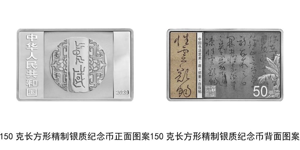 150克長方形銀質(zhì)紀念幣背面圖案為唐代懷素書《自敘帖》局部文字及“性靈豁暢”字樣與芭蕉、石頭、“中國書法藝術”篆刻鈐印等組合設計,并刊“中國書法藝術·唐·懷素·自敘帖”字樣及面額。