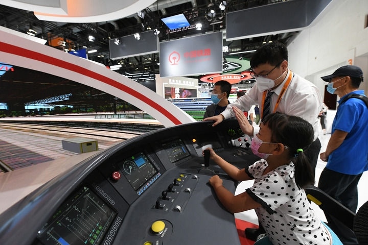 小朋友在2022年中國(guó)國(guó)際服務(wù)貿(mào)易交易會(huì)國(guó)家會(huì)議中心展館體驗(yàn)京張高鐵動(dòng)車(chē)組模擬駕駛臺(tái)(2022年9月3日攝)。新華社記者 任超 攝