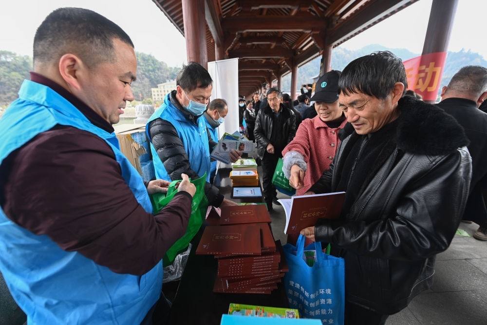 在杭州市臨安區(qū)昌化鎮(zhèn)舉行的春季文化科技衛(wèi)生“三下鄉(xiāng)”服務(wù)活動(dòng)上,臨安區(qū)科學(xué)技術(shù)協(xié)會(huì)“三服務(wù)”小分隊(duì)的黨員志愿者將科普書(shū)籍贈(zèng)送給當(dāng)?shù)厝罕姡?023年2月22日攝)。新華社記者 徐昱 攝