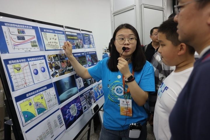 在中科院物理研究所超導(dǎo)國(guó)家重點(diǎn)實(shí)驗(yàn)室,志愿者在向參觀者普及超導(dǎo)知識(shí)(2023年5月13日攝)。新華社記者 金立旺 攝