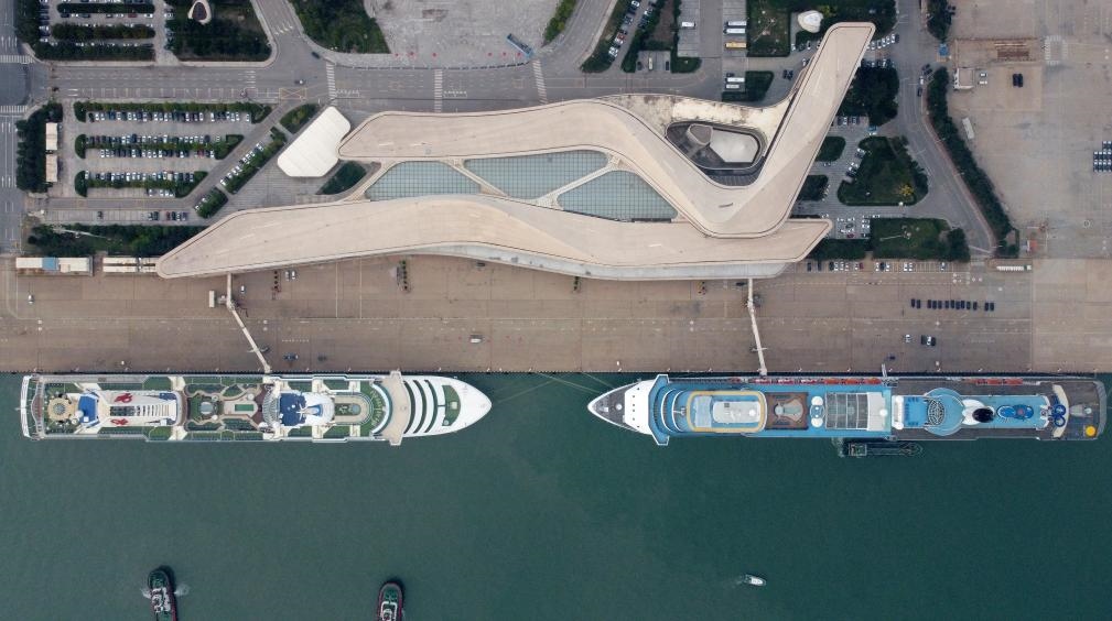 9月27日,“夢(mèng)想”號(hào)郵輪(左)、“地中?!碧?hào)郵輪靠泊在天津國際郵輪母港準(zhǔn)備啟航(無人機(jī)照片)。新華社記者 趙子碩 攝