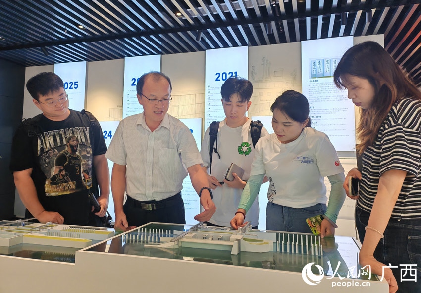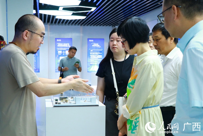 采訪團在西部陸海新通道南寧國際鐵路港展廳內采訪。人民網(wǎng) 嚴立政攝
