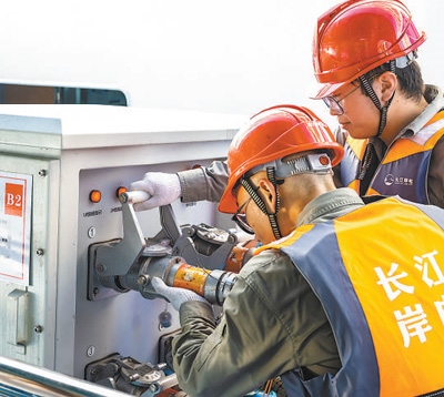 國網(wǎng)宜昌供電公司岸電運(yùn)維人員為靠泊船舶接通岸電。鄭家裕攝