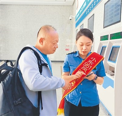 遼寧朝陽“小東951·鳳鳴朝陽”服務(wù)團(tuán)隊(duì)成員幫助旅客使用手機(jī)12306APP購票。沈陽局供圖