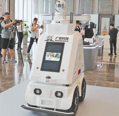 在2024蘇州國(guó)際科創(chuàng)大會(huì)場(chǎng)外,廣目科技展出的新款無(wú)人安防巡邏車(chē)。