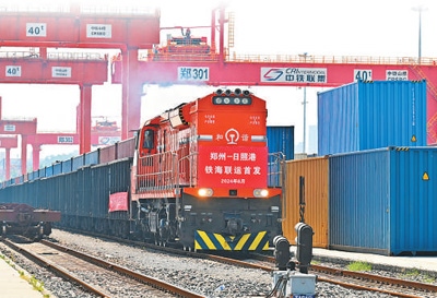 首趟鄭州至日照港鐵海聯(lián)運(yùn)班列從鄭州經(jīng)開區(qū)圃田站啟程。王 瑋攝(影像中國)