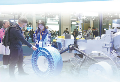 第七屆中國國際進(jìn)口博覽會上,觀眾正在了解米其林月球探測車輪胎。