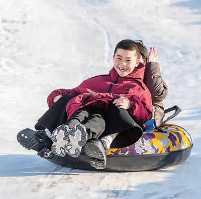 游客在甘肅張掖市甘州區(qū)冰雪世界絲路明珠歡樂(lè)谷滑雪圈。